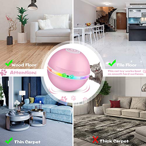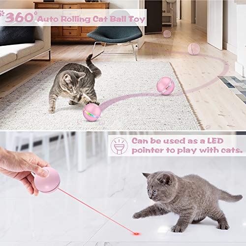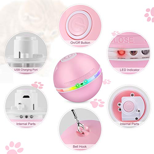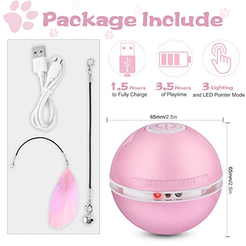 ✿✿【Repleto De CaracteríSticas Asombrosas】 Este juguete de bola giratorio inteligente para gatos de 360 grados viene con luces LED, carga USB y bonitos accesorios con pluma y campana. Las bolas de juguete interactivas para gatos tienen 3 modos de cambio. Modos: iluminación roja (en movimiento) -> Puntero LED (sin movimiento) -> iluminación colorida (en movimiento).