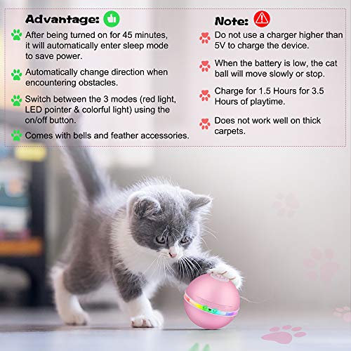 ✿✿【Batería Mejorada Más Segura】 Bola interactiva del juguete del gato, la batería de litio mejorada es mucho más segura y puede proporcionar hasta 3,5 horas de reproducción con 1,5 horas de carga. El juguete interactivo de bolas para gatos cambiará automáticamente de dirección al golpear un obstáculo. El mejor juguete de regalo para tu gato. Nota: no cargue el dispositivo con un cargador superior a 5v.